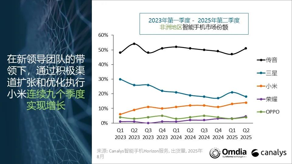 2025 年第二季度,非洲智高东说念主机市集增长 7%,连气儿九个季度保合手增长,传音踏实“非洲机王”的地位,小米合手续增长,荣耀增幅最大